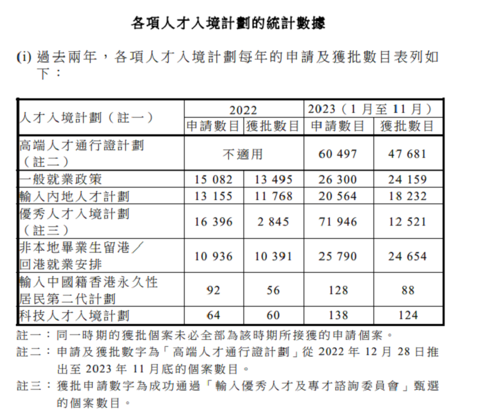 孙玉菡当日在立法会会议上书面答复议员有关招揽人才来港的提问。他表示,截至11月底,各项人才入境计划共收到超过20万宗申请,当中超过12万宗获批,约8600宗被拒。其中,「高端人才通行证计划」最受欢迎,接获超过60000宗申请,接近50000宗获批申请中,有超过四成B类及C类的申请者毕业于海外顶尖大学的学士课程。