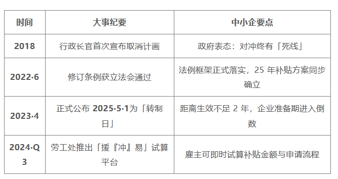 MPF 对冲取消由政策宣布到 2025转制日,政府花七年时间铺路,并推出政府资助计划帮雇主「卸力」。