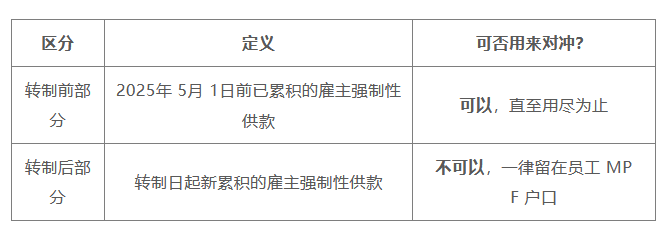 若转制前累积 MPF 雇主供款只有 HK$35,000,可对冲部分为 35,000,余额 HK$31,667 须由企业现金支付。
