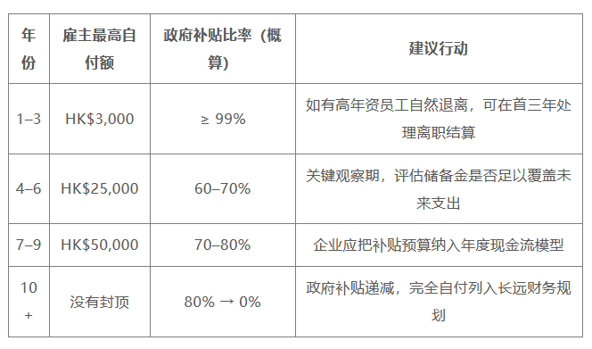 首三年雇主最高自付额仅 HK$3,000/名员工,之后逐步调高。
