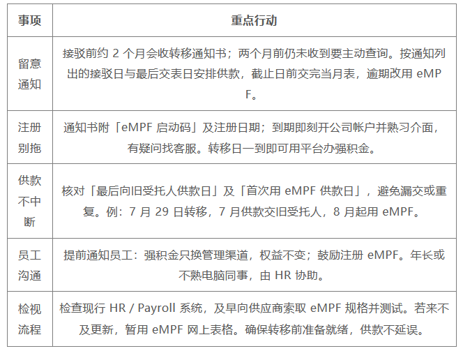 当公司的强积金计划正式转移至eMPF平台后,所有强积金行政工作将改由平台统一处理。雇主往后需要适应以下几方面的转变: