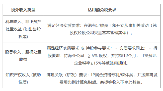 判定标准包括:香港公司必须是本地税务居民(或非居民在港有常设机构),并且在取得该项境外收入之前,对相关境外实体持股不低于5%且持续持有至少12个月。