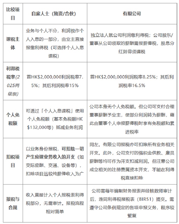 许多香港中小企业主和自雇人士都关心的问题:究竟自雇人士应否成立有限公司来节税? 本文将以中立专业的角度,结合2025年最新税务政策,深入探讨自雇经营与成立有限公司在香港的税务差异、节税攻略,以及各自的优劣,助你明智决策。