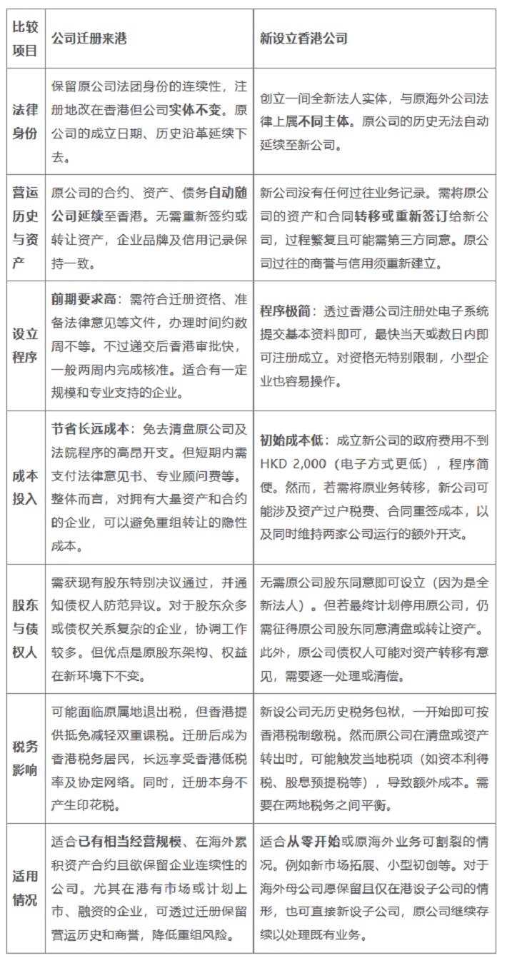 迁册来港与新设公司的比较