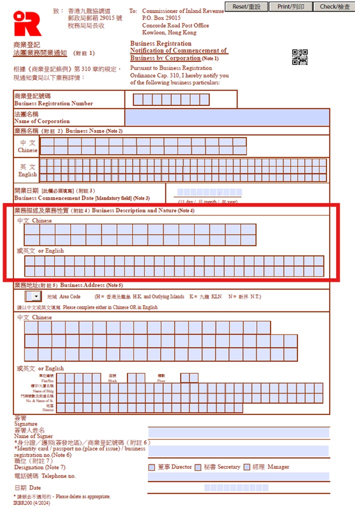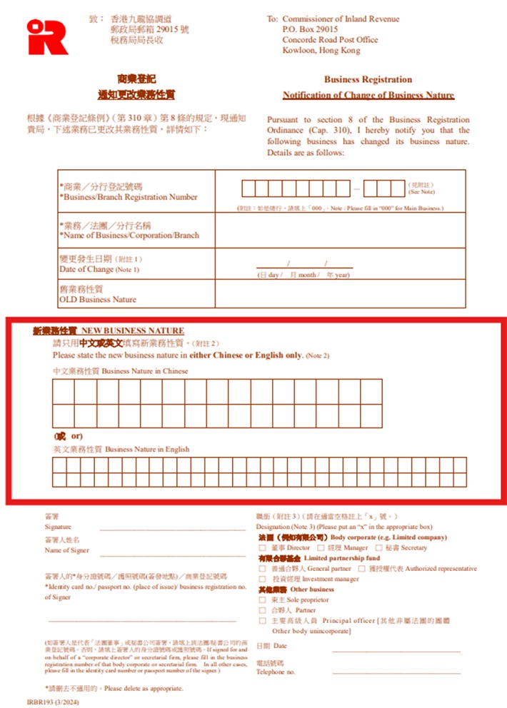 要留意:IRBR193 只适用于已曾经开业并已就开业作出通知、现因业务转型而需要更新数据的个案;如果你属首次通知开业(即之前未曾通知税务局公司/业务已开业),则应填交 IRBR200。