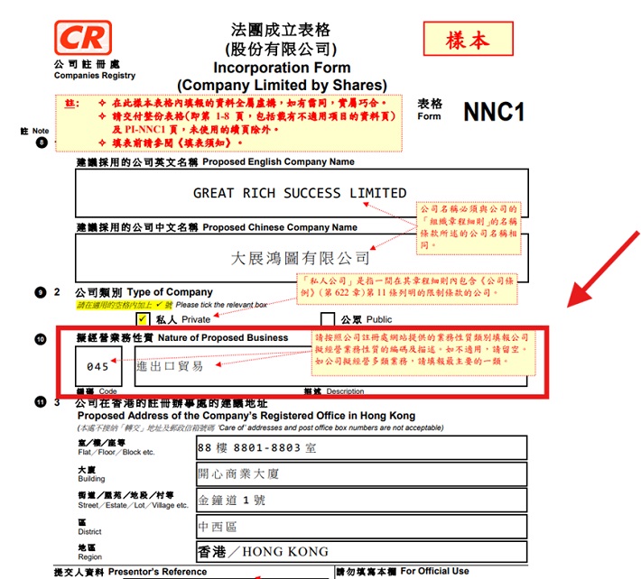 公司注册处对「业务性质」的填写用字有一定要求,常见做法是按其提供的业务性质编码及描述表去选择合适的类别。