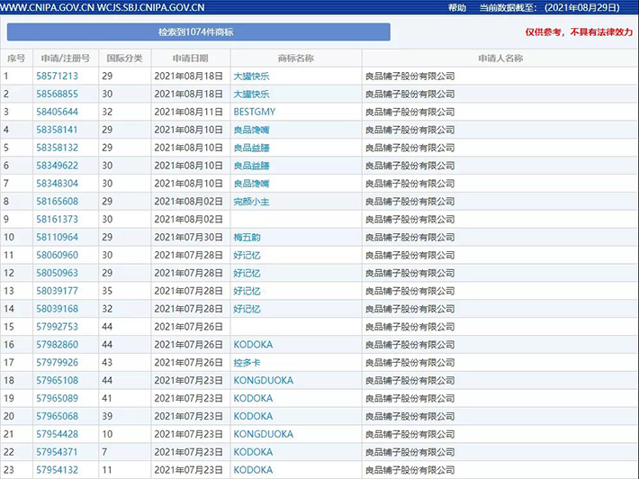 据中国商标局官网查询,截止目前,良品铺子股份有限公司共申请了1074件商标。