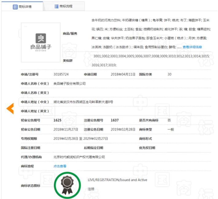 下面以【良品铺子】商标为例,文字、图形商标分开注册,后期使用时,可分开,可组合使用。