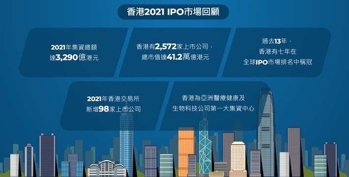 2021 年,香港交易及结算所有限公司(香港交易所)新增了 98 家上市公司,集资总额达到 3290 亿港元,还成为了亚洲医疗健康及生物科技公司第一大集资中心。截至 2021 年底,香港有 2572 家上市公司,总市值达 41.2 万亿港元。