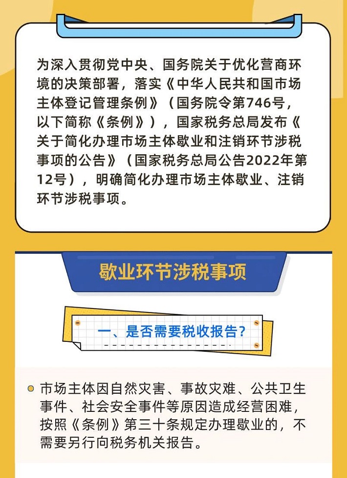 国家税务总局发布《关于简化办理市场主体歇业和注销环节涉税事项的公告》(国家税务总局公告2022年第12号),明确简化办理市场主体歇业。注销环节涉税事项。